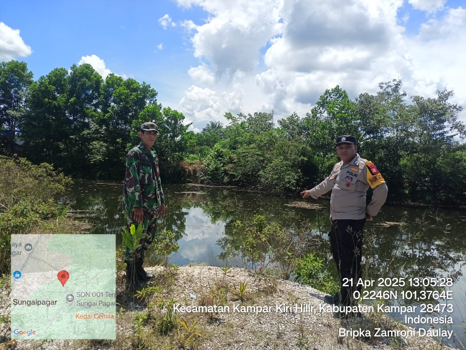 KAMPAR KIRI HILIR, KUJANGPOST.com – Bhabinkamtibmas Kelurahan Sungai Pagar, Bripka Zamroni Daulay, bersama Danpos Ramil Kecamatan Kampar Kiri Hilir, Peltu Rudi M. Tanjung, terus berupaya mencegah terjadinya kebakaran hutan dan lahan (karhutla) di wilayahnya. Pada Senin (20/04/2025) sekira pukul 13.00 WIB, Bripka Zamroni melakukan pengecekan embung di dua lokasi di Kelurahan Sungai Pagar serta menjalin sambang dengan warga dan mensosialisasikan tentang larangan membakar hutan dan lahan.