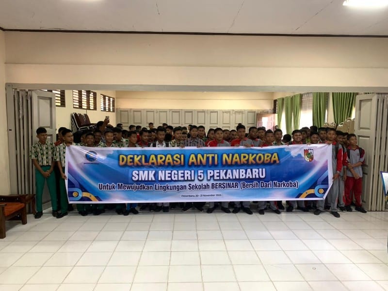 PEKANBARU, KUJANGPOST.com — Badan Narkotika Nasional (BNN) Kota Pekanbaru menggelar Sosialisasi dan Deklarasi Anti Narkoba di SMKN 5 Pekanbaru sebagai upaya memperkuat pemahaman serta kewaspadaan pelajar terhadap bahaya penyalahgunaan narkotika. Kegiatan berlangsung selama dua hari, 20–21 November 2025, dan dibagi menjadi empat sesi agar seluruh siswa dapat mengikuti materi secara maksimal.