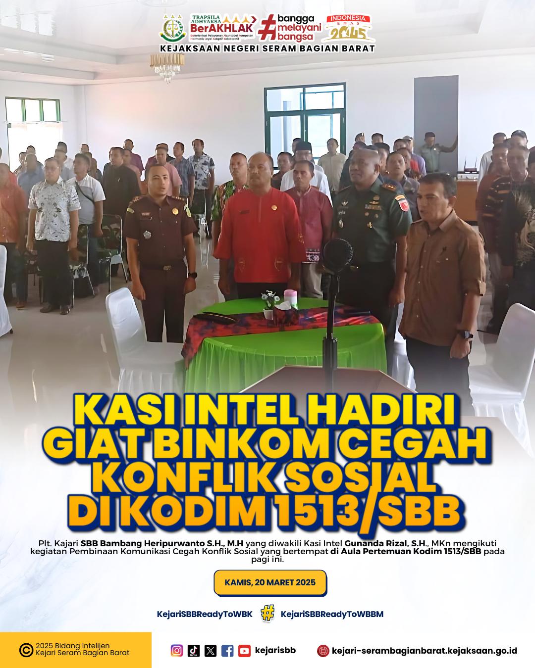 SERAM BAGIAN BARAT, KUJANGPOST.com – Piru, Kamis, 20 Maret 2025 Plt. Kajari SBB Bambang Heripurwanto S.H., M.H yang diwakili Kasi Intel Gunanda Rizal, S.H., MKn mengikuti kegiatan Pembinaan Komunikasi Cegah Konflik Sosial yang bertempat di Aula Pertemuan Kodim 1513/SBB.