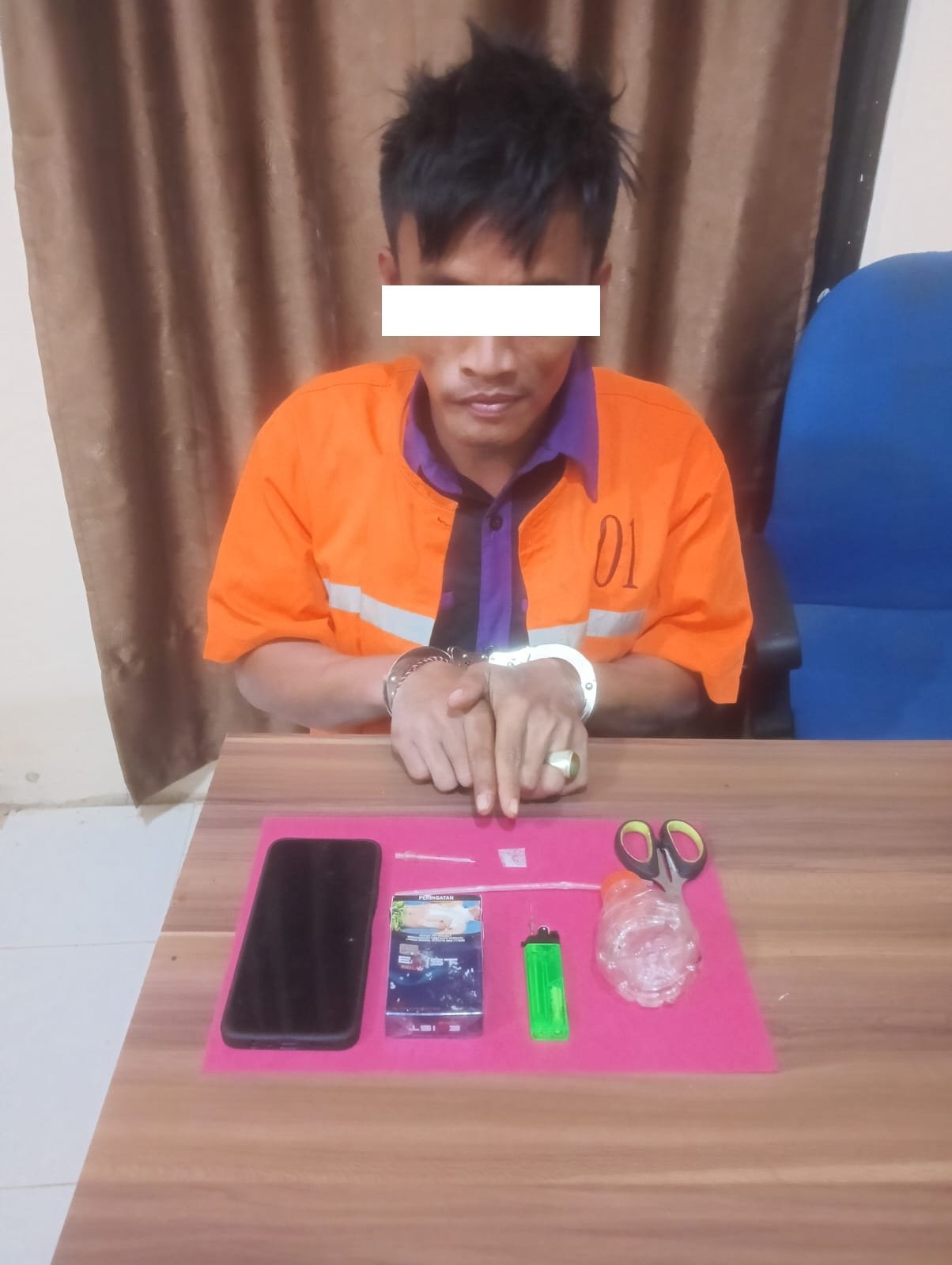 Saat dilakukan penggeledahan di lokasi, petugas menemukan sejumlah barang bukti yang berkaitan dengan tindak pidana narkotika. Barang bukti tersebut antara lain 1 paket kecil diduga narkotika jenis sabu yang disimpan di dalam kotak rokok, kemudian 1 unit handphone merek OPPO warna biru, serta alat hisap sabu berupa bong dan kaca pirek yang biasa digunakan untuk mengonsumsi narkotika. Selain itu, turut diamankan perlengkapan lain seperti korek api dan gunting yang diduga digunakan dalam aktivitas tersebut.