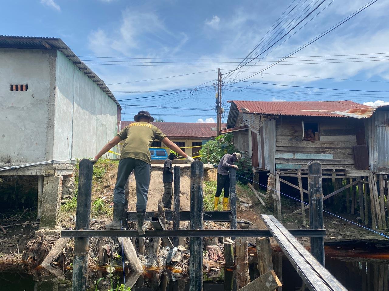 Di lokasi pertama yang berada di Jalan Perintis, Kelurahan Bumi Ayu, Kecamatan Dumai Selatan, pekerjaan difokuskan pada pemindahan scor dan kayu serta pemasangan struktur penyangga jembatan. Kegiatan ini melibatkan gabungan personel kepolisian dan relawan yang bekerja secara gotong royong.
