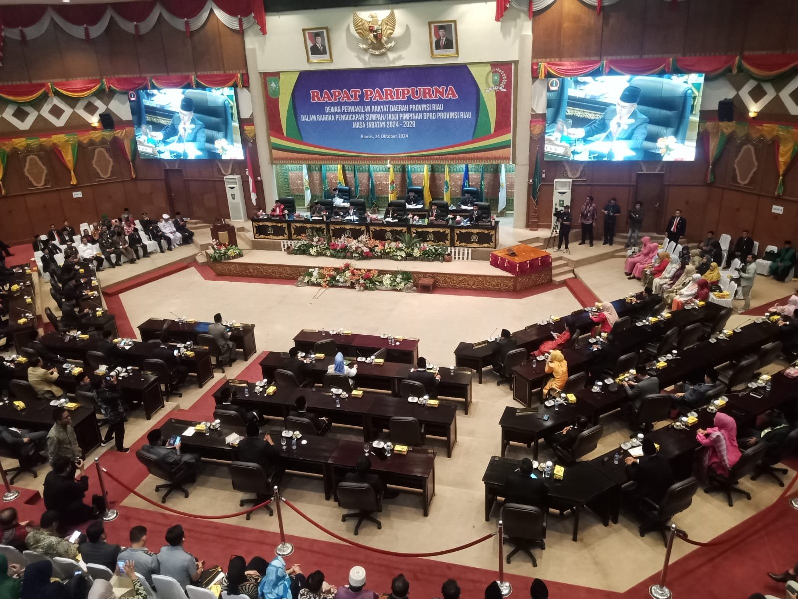 Pengambilan sumpah jabatan dipimpin oleh Ketua Sementara, Maamun Solihin. Sementara, empat pimpinan yang dilantik adalah Ketua DPRD Provinsi Riau, Kaderismanto dari PDIP.