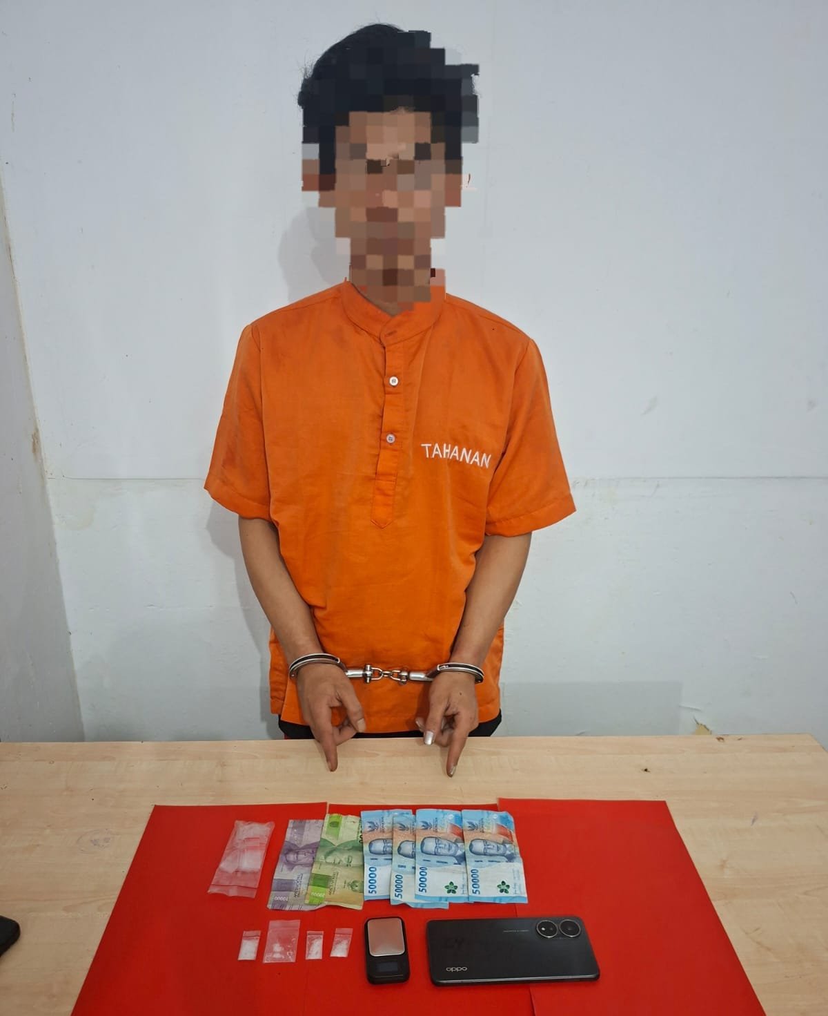 Saat petugas mendekati, laki-laki tersebut melarikan diri sehingga dilakukan pengejaran sejauh kurang lebih 100 meter dan berhasil diamankan. “Kemudian dilakukan penggeledahan badan dan tempat tinggal yang disaksikan oleh perangkat desa setempat, dan ditemukan 4 paket narkotika jenis shabu-shabu dengan berat bruto 1,27 gram, timbangan digital, unit handphone, serta uang tunai sebesar Rp230.000,”terangnya.