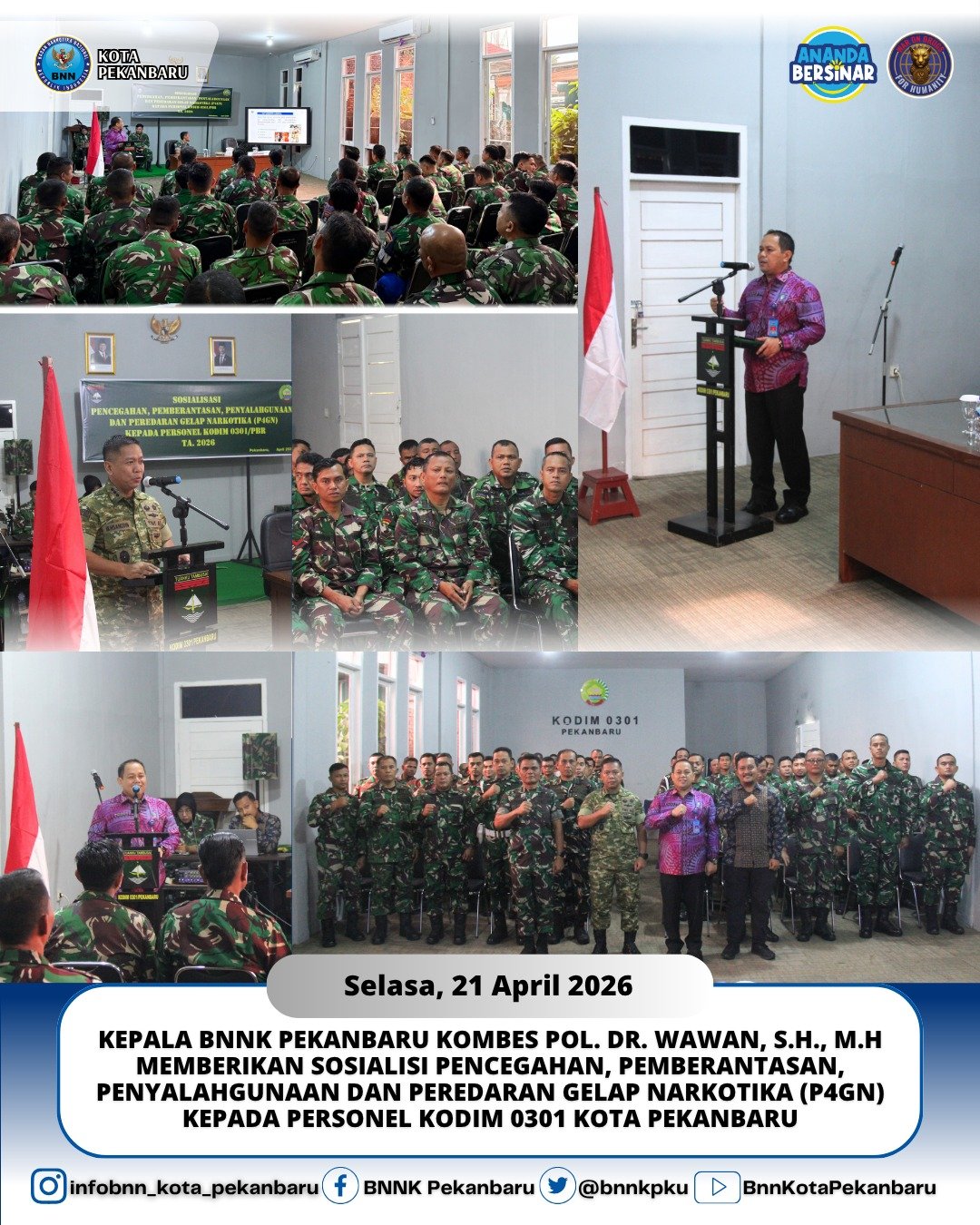 PEKANBARU, KUJANGPOST.com — Badan Narkotika Nasional Kota (BNNK) Pekanbaru terus mengintensifkan upaya pencegahan dan pemberantasan narkoba melalui penguatan kolaborasi lintas sektor. Kali ini, sinergi tersebut diwujudkan melalui kegiatan sosialisasi P4GN (Pencegahan dan Pemberantasan Penyalahgunaan dan Peredaran Gelap Narkotika) di lingkungan Kodim 0301/Pekanbaru, Kamis (21/4/2026).