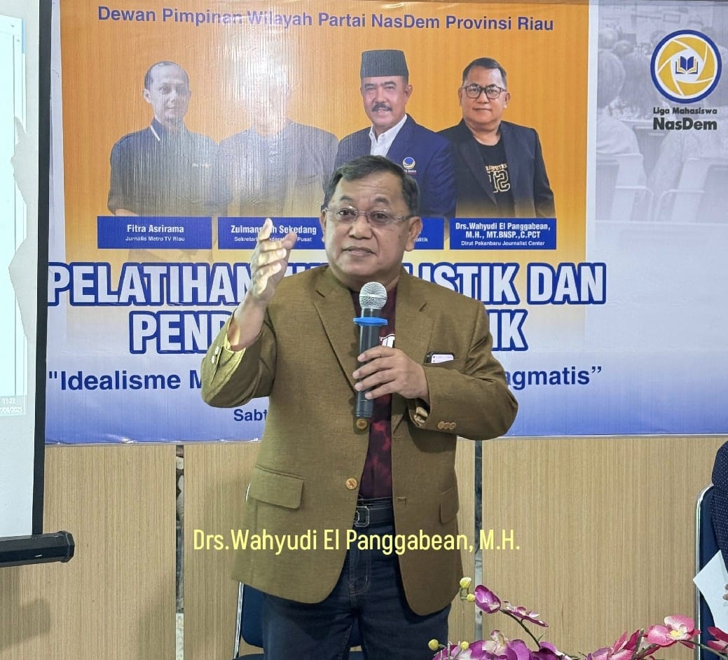 “Makanya, saya sangat mengapresiasi Nasdem Riau, yang menyelenggarakan acara ini,” kata Direktur Utama, Lembaga Pendidikan Wartawan, Pekanbaru Journalist Center (PJC) Drs.Wahyudi El Panggabean, M.H., MT.BNSP., C.PCT, Sabtu (27/9).