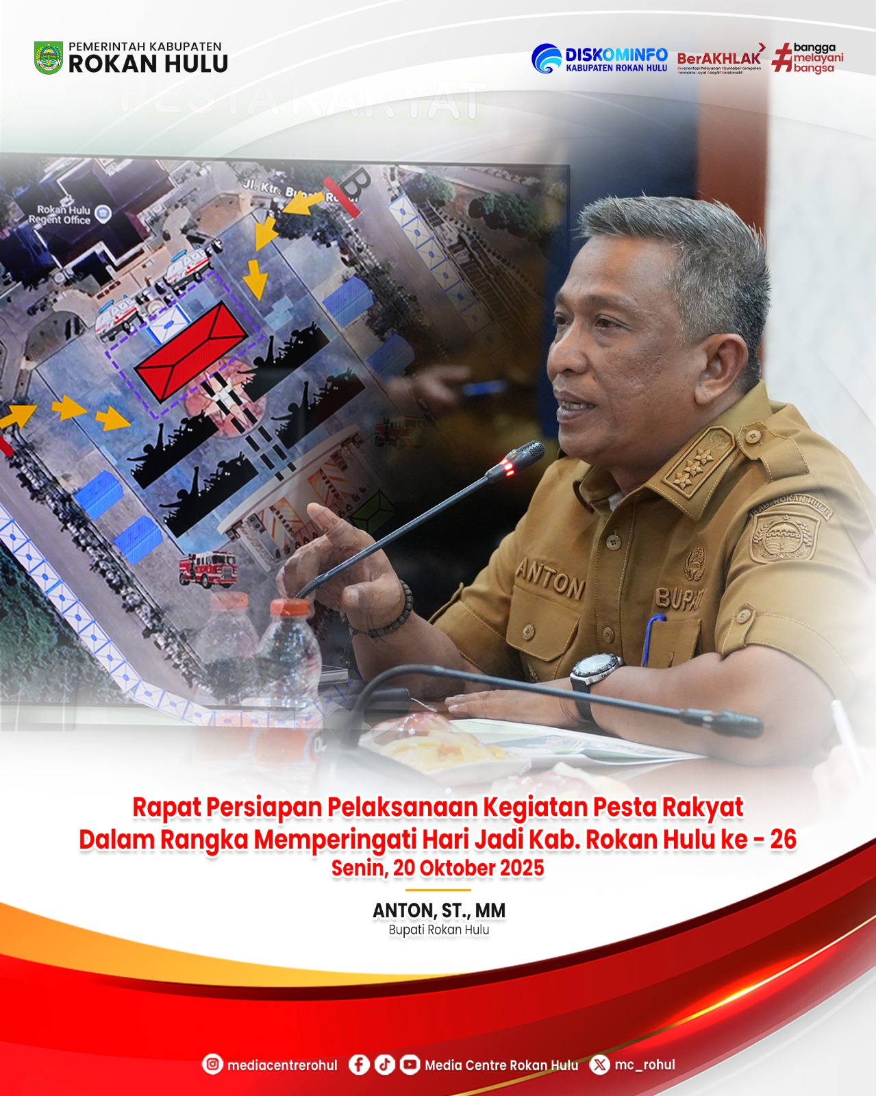 Rohul | KUJANGPOST.com – Menjelang pelaksanaan malam puncak pesta rakyat dalam rangka Hari Jadi Kabupaten Rokan Hulu (Rohul) ke-26 tahun yang berlangsung pada tanggal 25 nanti, Bupati Rohul Anton, ST, MM memimpin rapat finalisasi persiapan di Ruang rapat Rumah Dinas Bupati, Senin (20/10/2025).