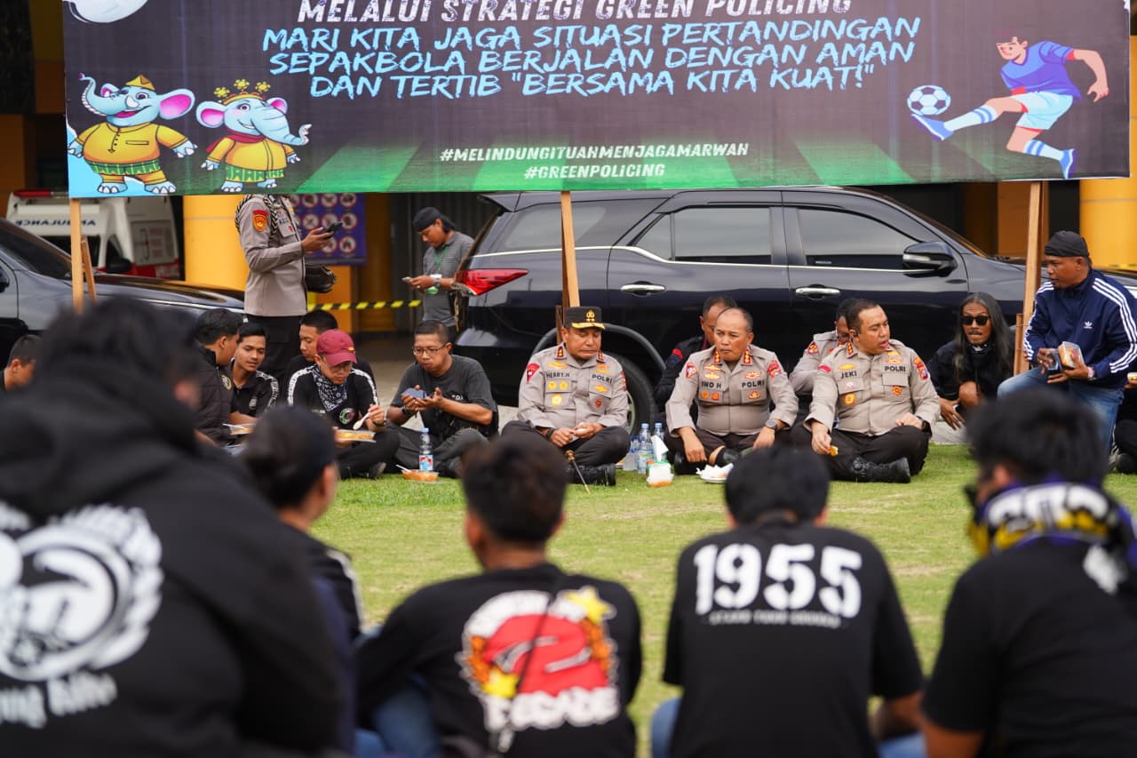 Suasana penuh keakraban terasa saat Irjen Herry bersama jajaran Polda Riau duduk bersama para suporter di taman teras depan stadion, dilanjutkan dengan makan bersama yang disiapkan oleh Dapur Umum Korps Brimob Polda Riau.