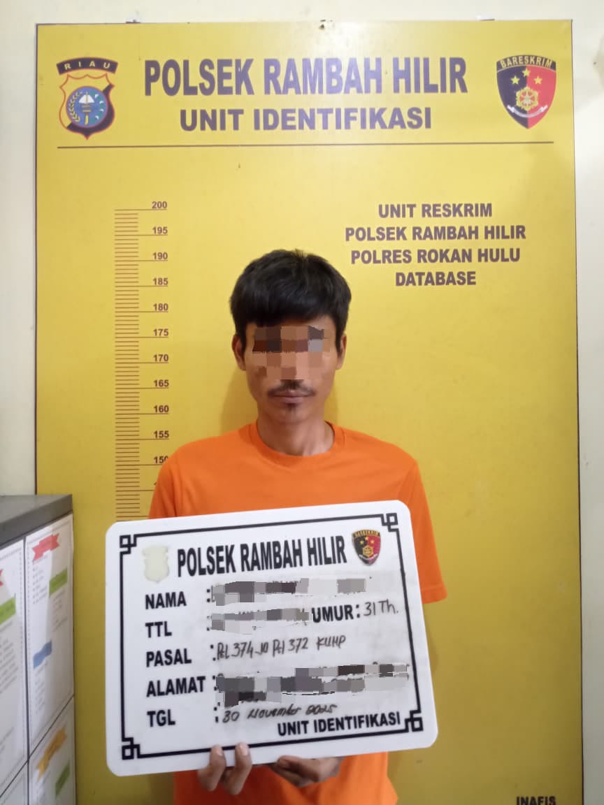Kapolsek Rambah Hilir menyampaikan bahwa pelaku dijerat Pasal 374 jo Pasal 372 Nomor 1 Tahun 1946 tentang Peraturan Hukum Pidana. Penyidik telah memeriksa saksi-saksi, mengamankan barang bukti, serta melengkapi administrasi penyidikan. Dalam waktu dekat, penyidik akan melakukan gelar perkara dan berkoordinasi dengan Jaksa Penuntut Umum.