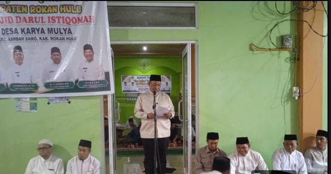 Rokan hulu | KUJANGPOST.com- Bupati Rokan Hulu (Rohul) Anton, ST, MM, melaksanakan Safari Ramadan 1447 H di Masjid Darul Istiqomah, Desa Karya Mulya, Kecamatan Rambah Samo, Jumat (27/2/2026). Dalam kegiatan tersebut, Bupati menyerahkan bantuan sosial sekaligus menyerap langsung aspirasi masyarakat terkait pembangunan infrastruktur desa.
