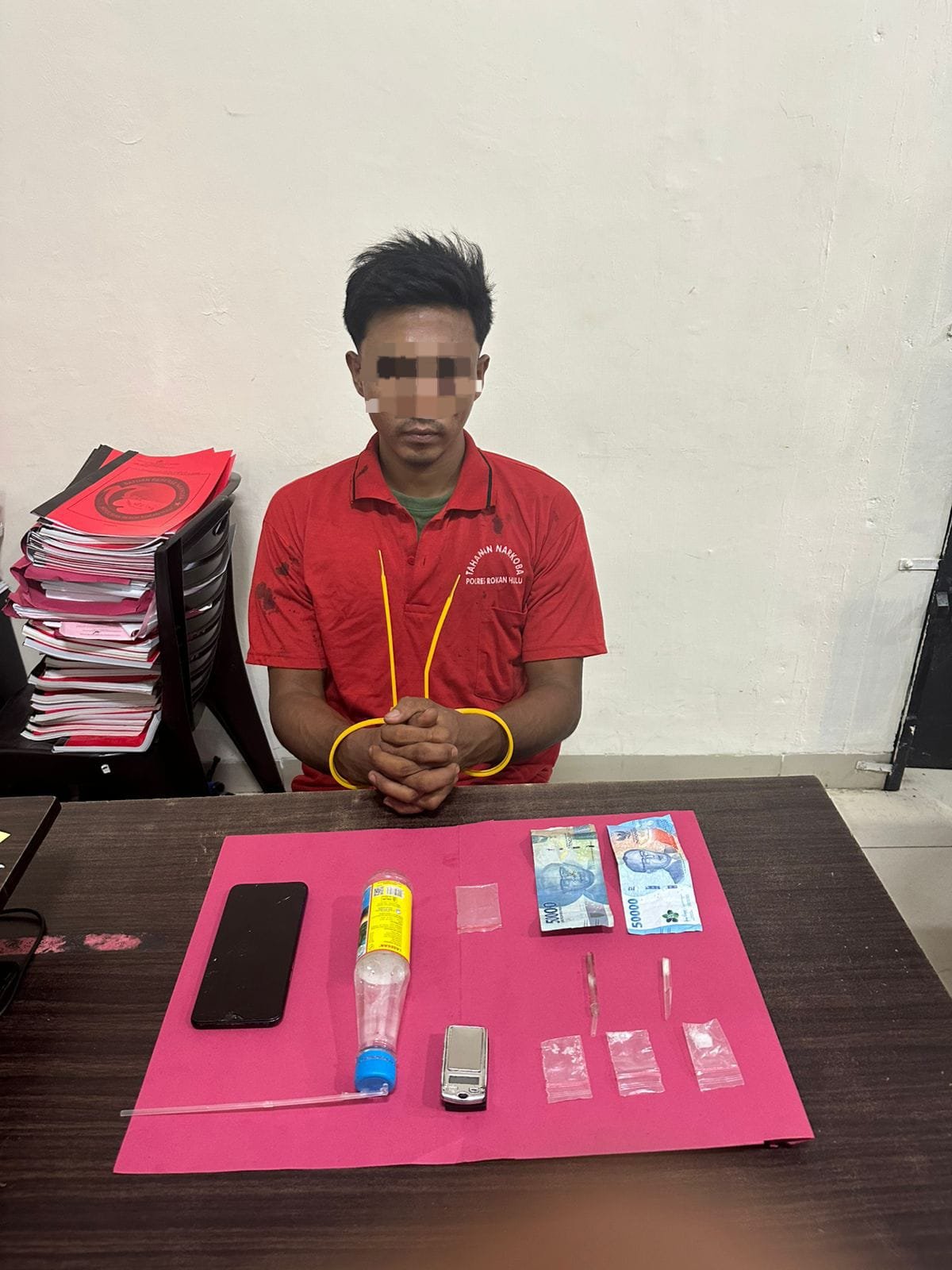 Dari tangan tersangka, petugas menyita sejumlah barang bukti, di antaranya tiga paket narkotika jenis sabu dalam plastik bening, uang tunai sebesar Rp100.000,-, satu bong terbuat dari botol plastik, satu timbangan digital, alat hisap berupa sendok dari pipet dan kaca pirex, serta satu unit handphone merek Oppo warna biru yang digunakan untuk transaksi.