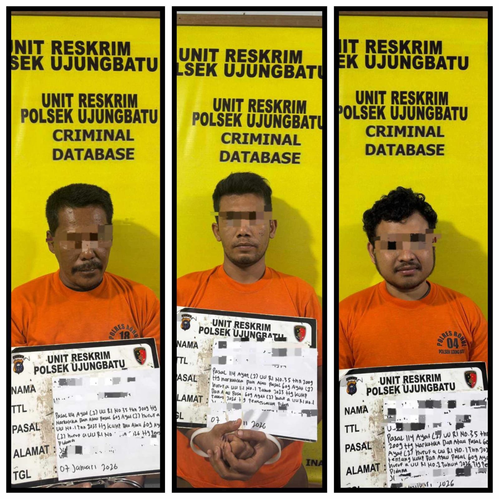 Rokan Hulu | KUJANGPOST.com-Polsek Ujungbatu, Polres Rokan Hulu, berhasil mengungkap kasus peredaran narkotika jenis sabu dan mengamankan tiga orang pelaku yang diduga sebagai pengedar. Penangkapan dilakukan pada Rabu (7/1/2026) sekitar pukul 16.00 WIB di sebuah ruko yang berlokasi di Jalan Sudirman Km 04, Desa Ujung Batu Timur, Kecamatan Ujung Batu, Kabupaten Rokan Hulu.
