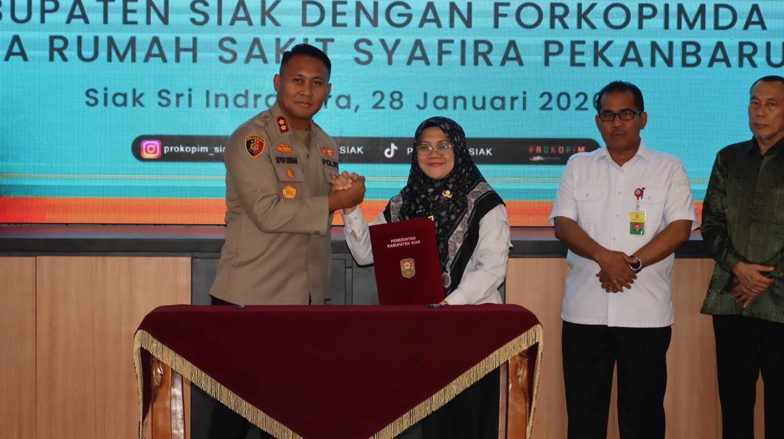Nota kesepakatan ditandatangani oleh Bupati Siak Dr. Afni Zulkifli, M.Si. bersama Kapolres Siak AKBP Sepuh Ade Irsyam Siregar, S.H., S.I.K., M.H. Sementara itu, perjanjian kerja sama teknis ditandatangani oleh Sekda Kabupaten Siak dengan Wakapolres Siak.