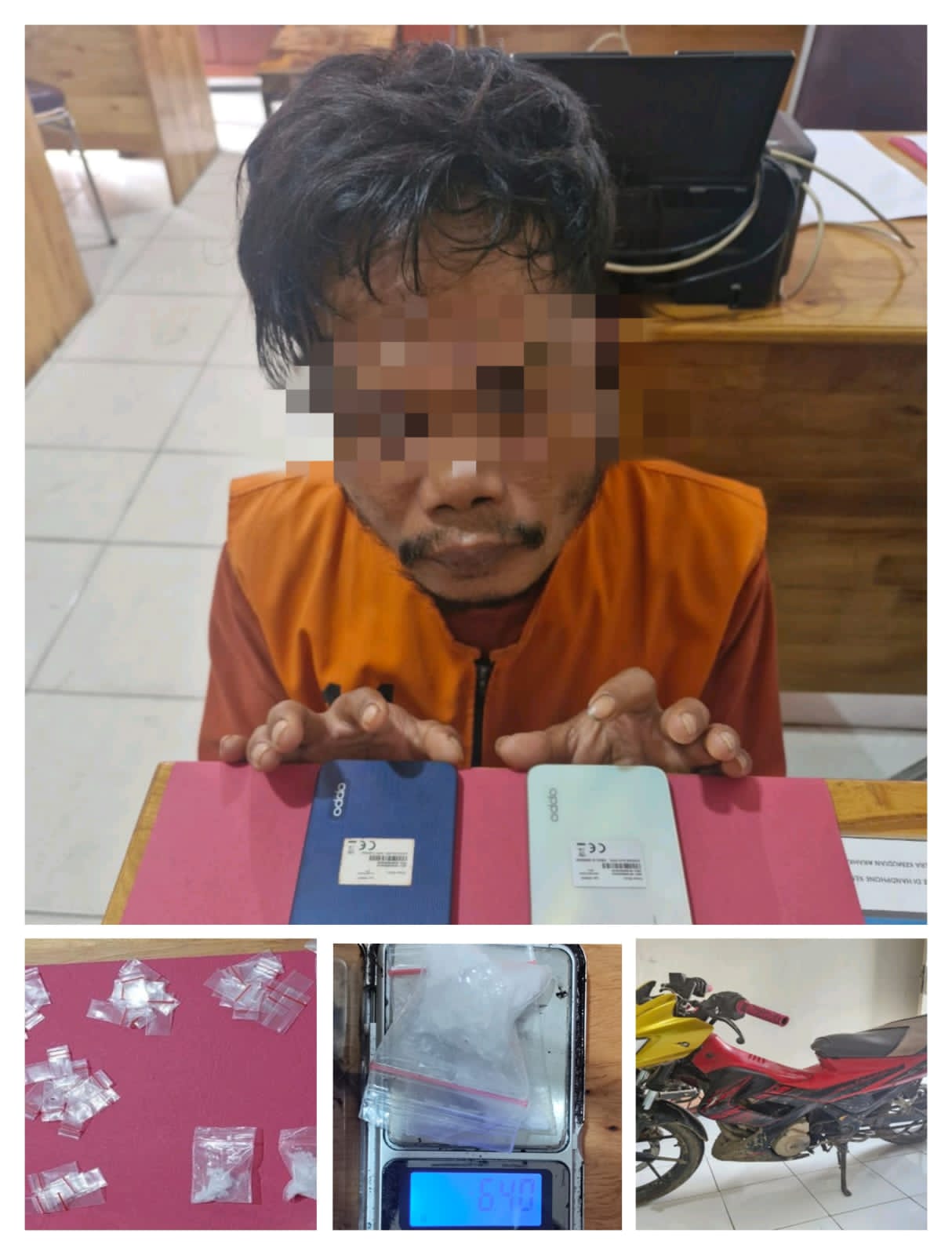 Kasat Resnarkoba menjelaskan, “Barang bukti yang ditemukan adalah 2 paket narkotika jenis shabu dengan berat kotor 6,4 gram, 67 plastik klip bening kosong, 1 unit sepeda motor Suzuki FU tanpa nomor polisi, 1 buah plastik hitam pembungkus, 2 unit handphone merk Oppo.”
