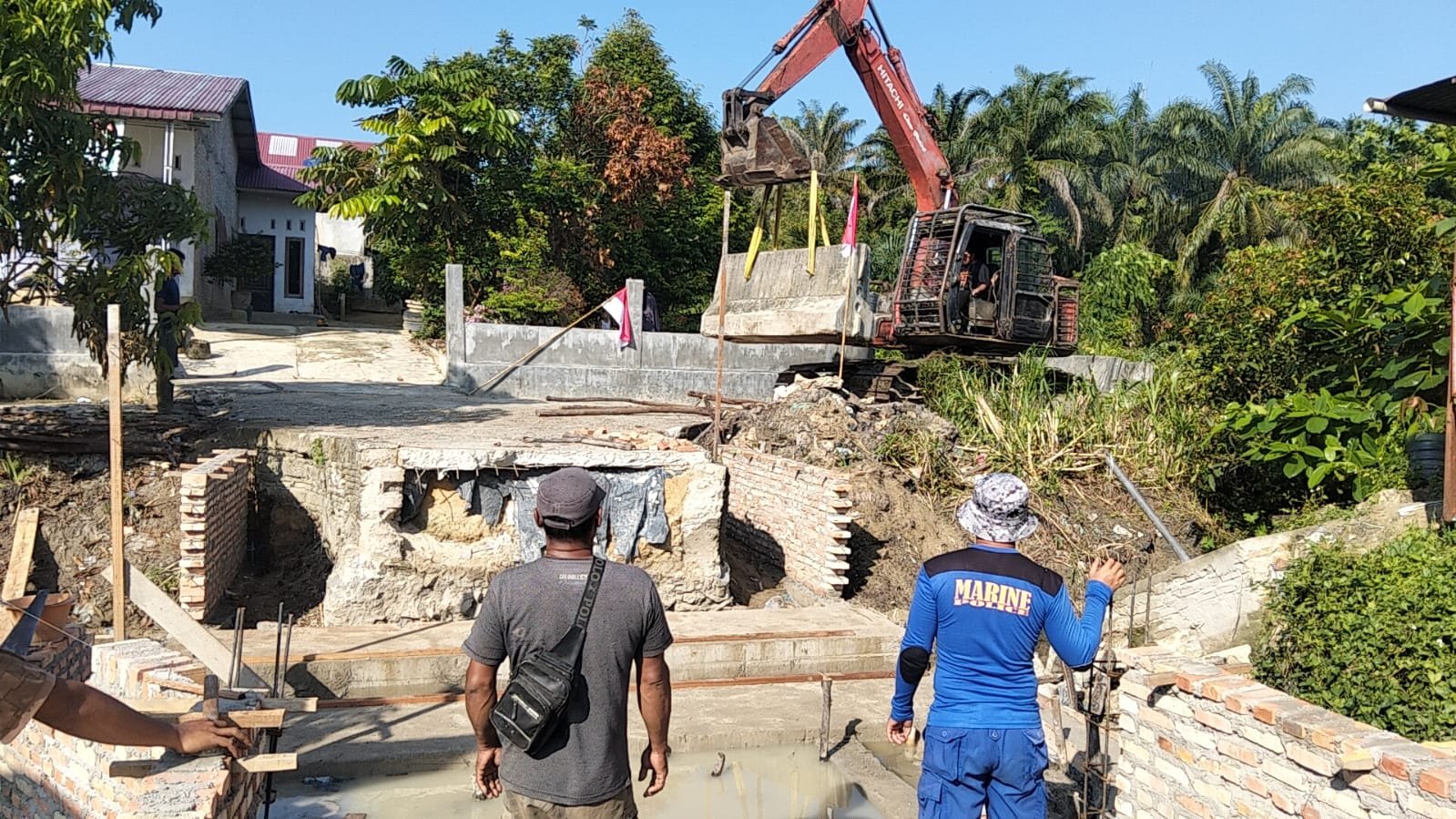 Sementara itu, di Kelurahan Telaga Sam Sam, Kecamatan Kandis, progres pengerjaan menyentuh aspek struktural yang cukup berat. Personel yang terlibat lebih beragam, melibatkan personel Polsek Kandis, BKO Brimob, Dit Sabhara, hingga Pol Air, serta bantuan alat berat berupa ekskavator.