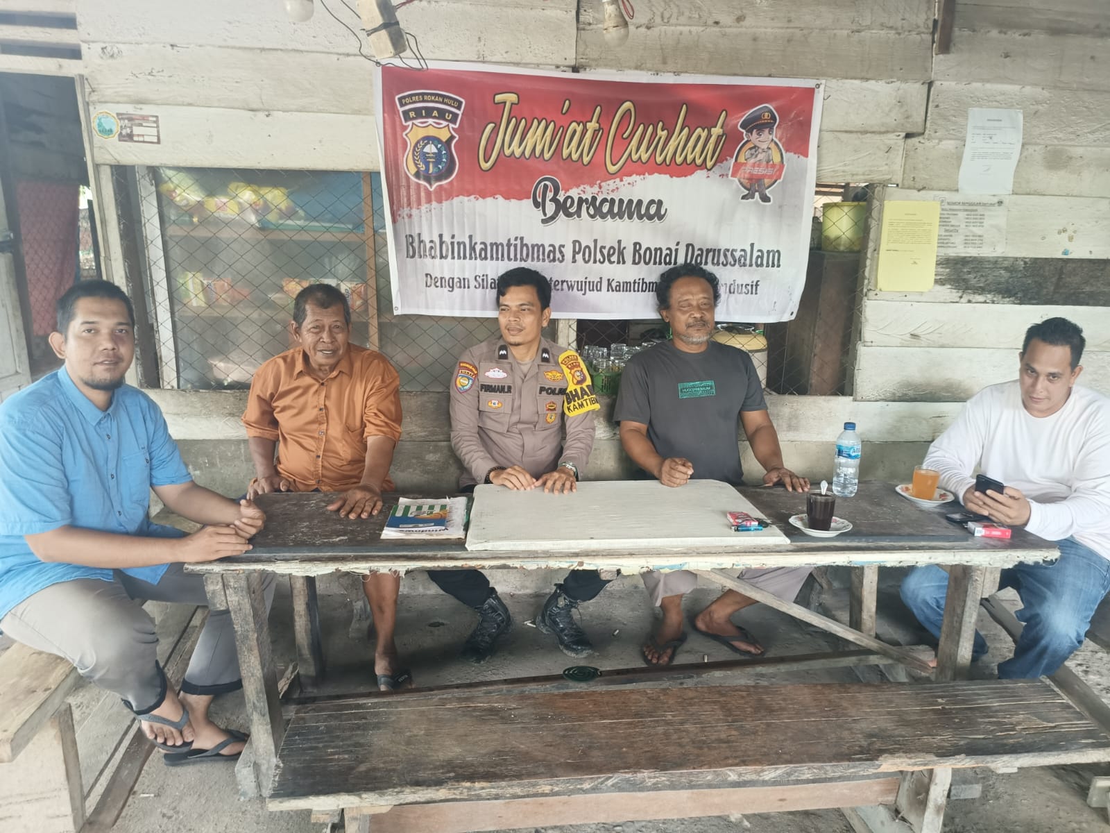Dalam kegiatan Jumat Curhat, Kapolsek Bonaidarussalam Iptu Romi Yendri SH MH melalui Bhabinkamtibmas Aipda Firman Ritonga mengucapkan terimakasih Kepada Tokoh Masyarakat dan Pemuda Desa Bonai selama ini membantu pihak Polsek Bonai Darussalam dalam menjaga Kamtibmas kondusif.