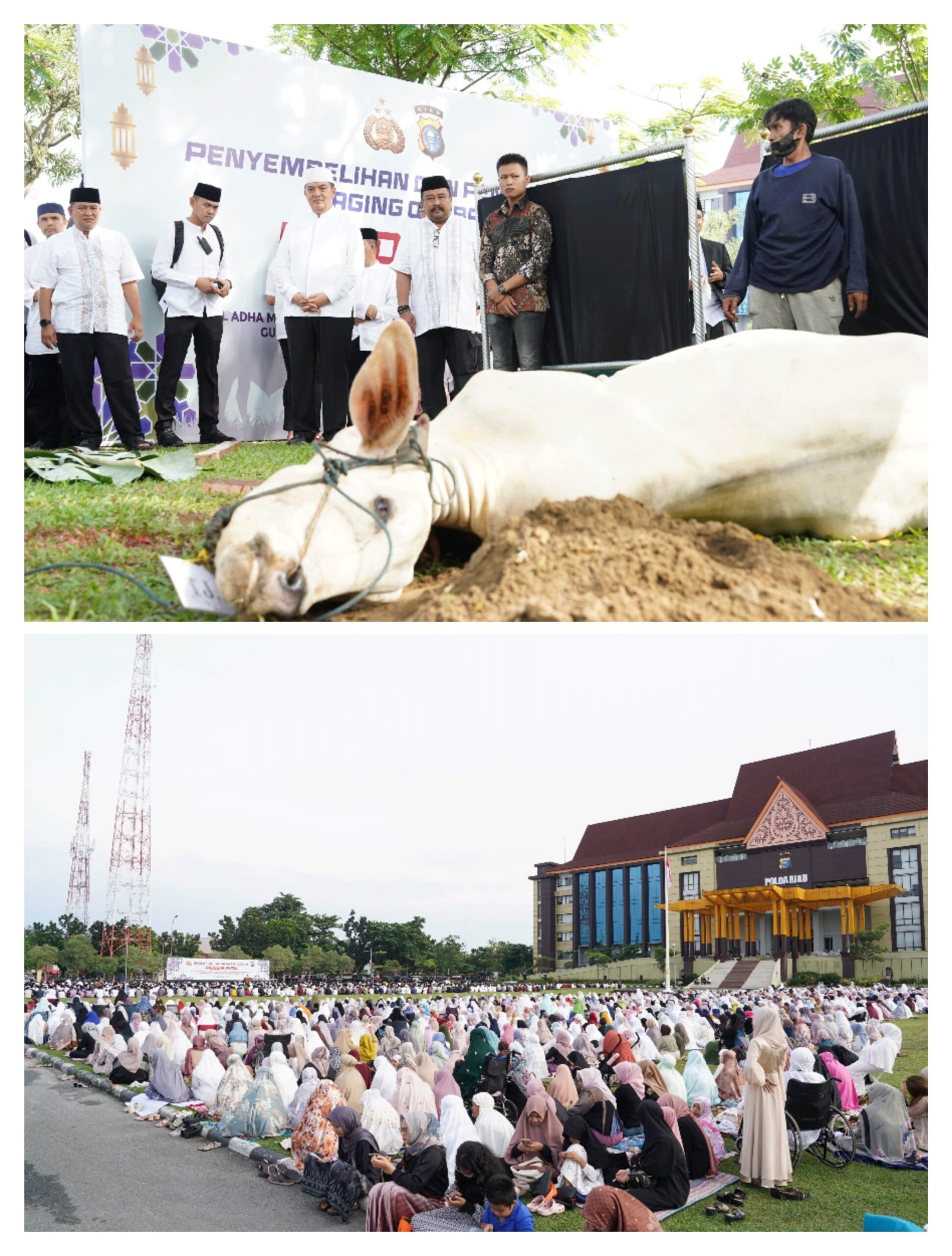 Sebelum penyaluran dan penyembelihan hewan kurban, Polda Riau juga menggelar salat Iduladha 1445 H secara berjamaah yang dihadiri ribuan jemaah
