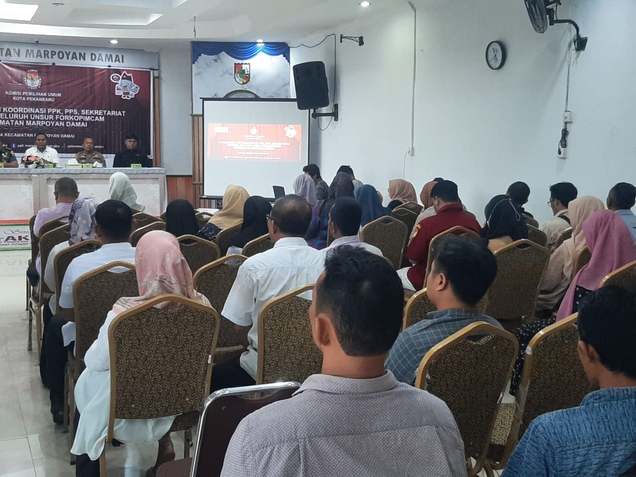 Kegiatan silahturahmi dan rapat koordinasi penyelenggaraan tahapan Pilkada Serentak Tahun 2024 dihadiri oleh Camat Marpoyan Damai FAUZAN, S.STP, Danramil 02 Kota LETKOL KAV. AGUSSYAM, Kapolsek Bukit Raya AKP SYAFNIL, S.H., M.H, Ketua PPK Kec. Marpoyan Damai RIZKI NANDA PUTRA, Komisioner PPK Kec. Marpoyan Damai DWI HELMA PUTRI, Komisioner PPK Kec. Marpoyan Damai ZULFADLI, Komisioner PPK Kec. Marpoyan Damai SITI BULKIYAH, Komisioner PPK Kec. Marpoyan Damai ALDI ROZA, Ketua Panwas Kec. Marpoyan Damai JOIFIKAR, Bhabinkamtibmas se Kec. Marpoyan Damai, Babinsa TNI AD se Kec. Marpoyan Damai, Babinpotdirga Lanud Roesmin Nurjadin SERKA ATWIYANTO, Panwascam dan PKD se Kec. Marpoyan Damai, Ketua dan Anggota PPS se Kecamatan Marpoyan Damai.