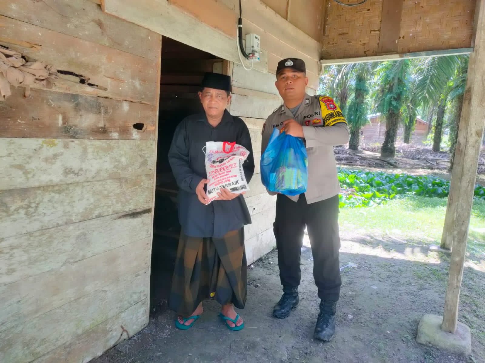Tak hanya itu, Brigpol C Sirait memberikan tali asih atau bantuan, berupa Sembako yakni Beras, Susu, Telur, Minyak Goreng dan Gula kepada Jumianto yang berasal program Kapolsek Tambusai Utara Iptu Suheri Sitorus SH