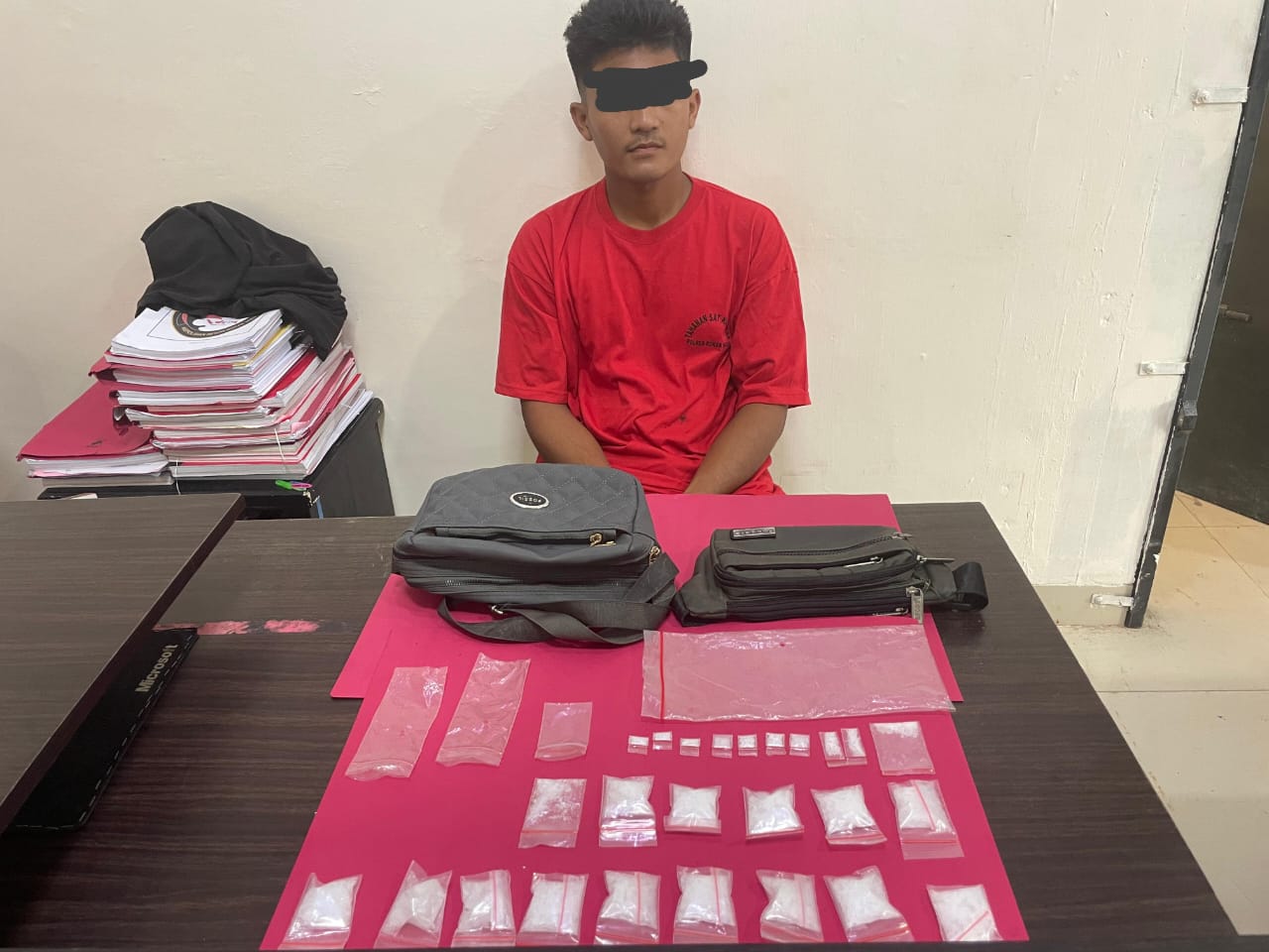 Berbekal informasi dari masyarakat tersebut, personil Satresnarkoba Polres Rokan Hulu yang dipimpin oleh Aipda Ronaldi melakukan Penangkapan terhadap AP dengan barang bukti berupa 25 (dua puluh lima) Paket Narkotika jenis sabu yg dibungkus Plastik klip warna Putih Bening, 4 (empat) lembar Plastik klip warna Putih Bening, 1 (satu) buah Tas warna Hijau merk SPORT, 1 (satu) buah Tas warna Abu-abu merk FOSSIL.