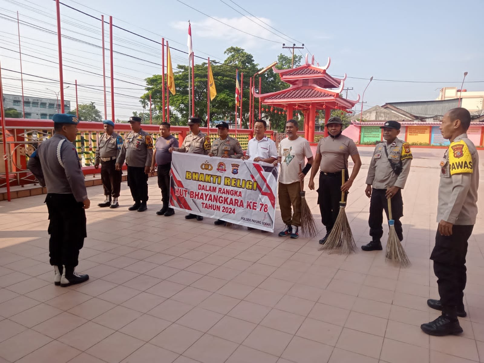 ” Kegiatan Bakti Religi dalam rangka menyambut HUT Bhayangkara Ke 78 tahun 2024 ini, personil melaksanakan kegiatan bersih-bersih di area vihara ” , jelas Rejoice.