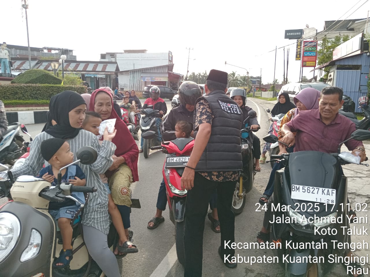 Kapolres Kuantan Singingi AKBP Angga F. Herlambang, S.I.K., S.H., melalui Kasat Resnarkoba Polres Kuansing, AKP Novris H. Sumanjuntak, S.H., M.H., menyampaikan Dalam kesempatan tersebut, sebanyak 100 paket takjil dibagikan kepada para pengguna jalan yang melintas menjelang waktu berbuka puasa. Kegiatan ini merupakan bentuk kepedulian Polres Kuansing terhadap masyarakat, khususnya bagi mereka yang sedang dalam perjalanan dan belum sempat menyiapkan makanan untuk berbuka.