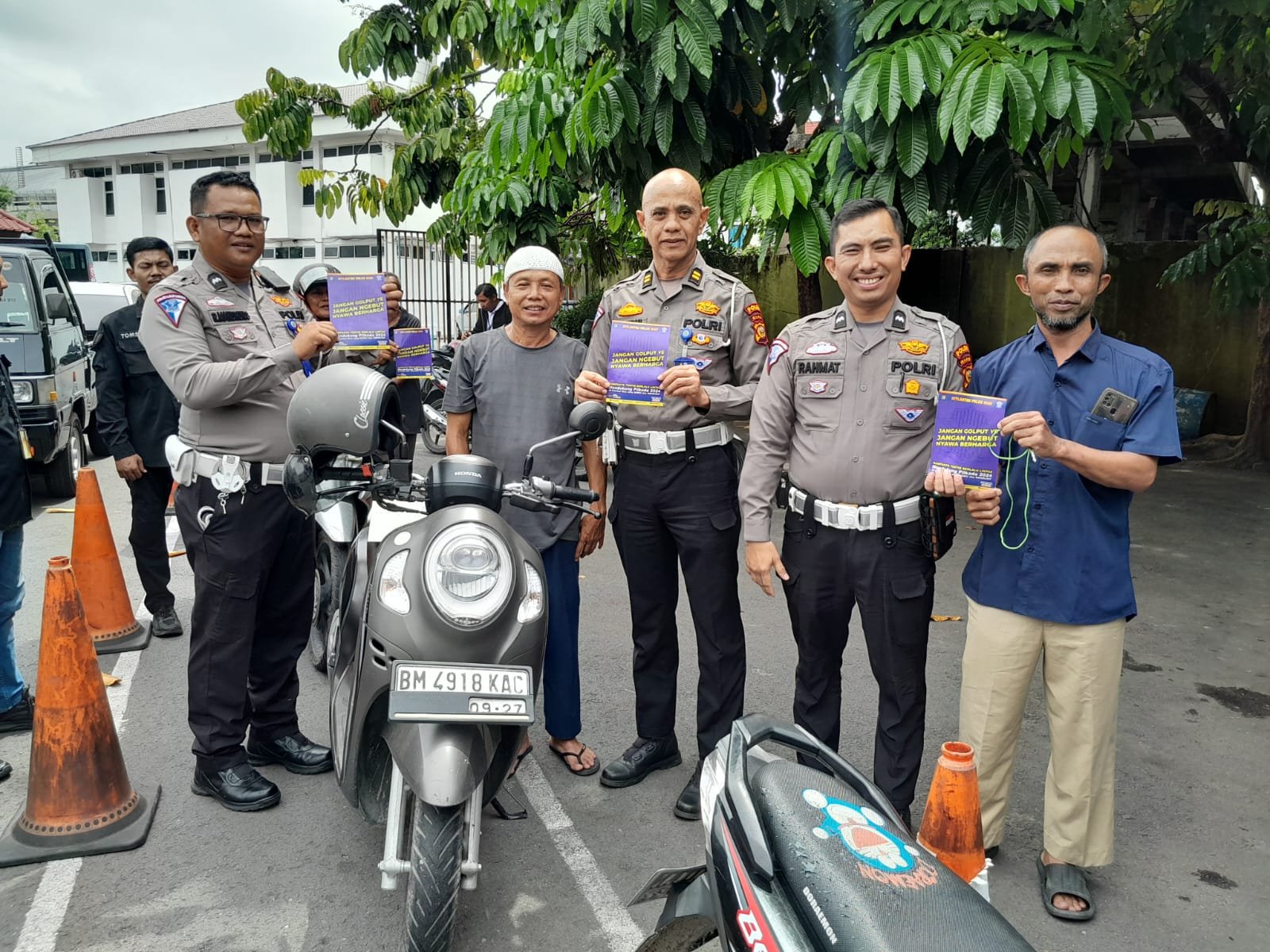 Dari lokasi kegiatan sosialisasi tersebut, tampak personel Ditlantas Polda Riau membagikan air mineral dan permen kepada para pengunjung kantor layanan Cek Fisik Ditlantas Polda Riau.