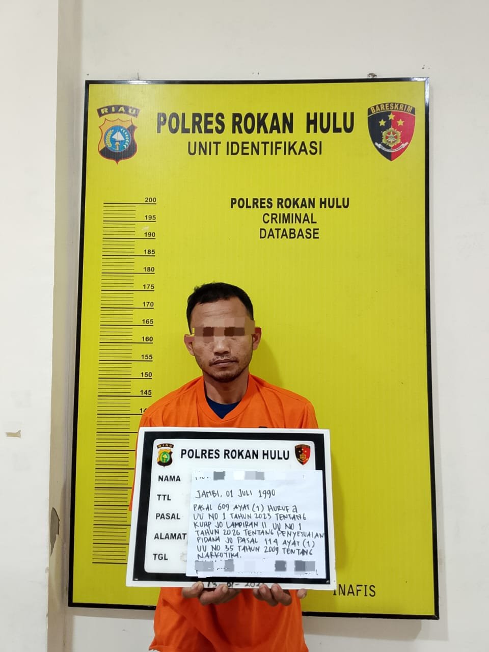 Atas perbuatannya, tersangka kini diamankan di Polres Rokan Hulu untuk menjalani proses hukum lebih lanjut. Ia dijerat dengan Pasal 609 ayat (1) huruf a Undang-Undang Nomor 1 Tahun 2023 tentang KUHP juncto Lampiran II Undang-Undang Nomor 1 Tahun 2026 tentang Penyesuaian Pidana serta Pasal 114 ayat (1) Undang-Undang Nomor 35 Tahun 2009 tentang Narkotika.