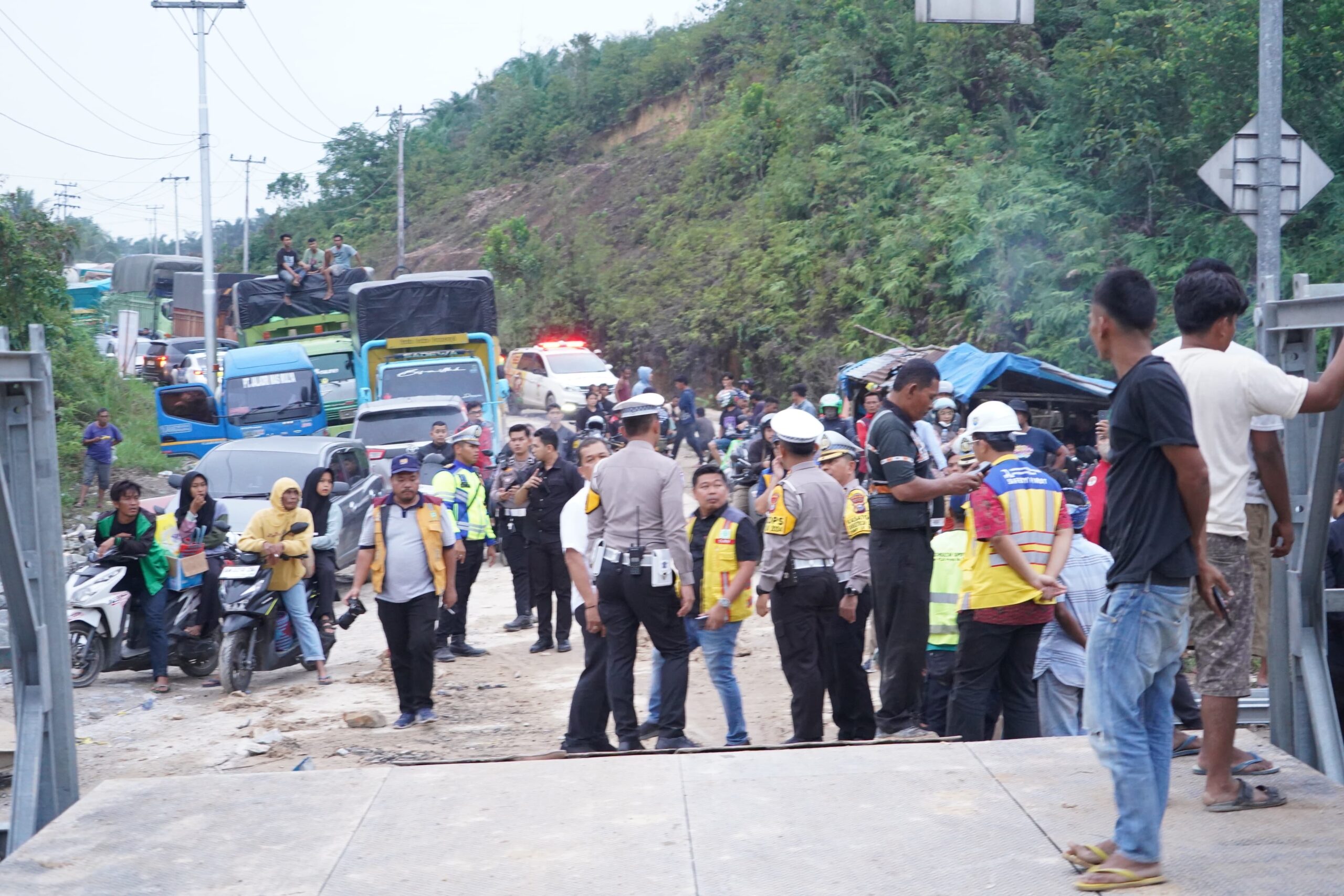 “Kami faham dan sangat prihatin apa yang saudara kami alami saat ini, mohon kerjasamanya dan tetap bersabar, kita kawal pembuatan jalan alternatif ini, namun kita butuh kerjasama saudara semua dengan mengikuti arahan petugas dilapangan, bila mana nanti jalan alternatif bisa digunakan jangan saling mendahului, mohon tertib dan ikuti arahan petugas, jaga keamanan diri dan barang bawaan nya. Petugas akan kita kawal dan maksimal dalam mengerjakan jalan alternatif ini,” ucap Dirlantas Polda kepada para supir yang terjebak macet.