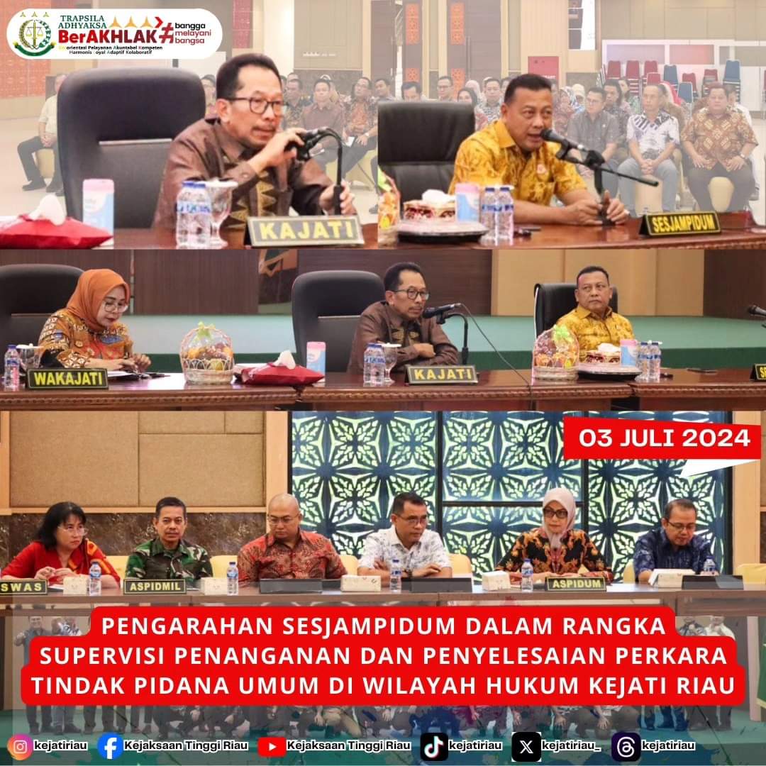 PEKANBARU, KUJANGPOST.com – Bahwa pada hari Jumat Tanggal 05 Juli 2024 sekira pukul 09.00 Wib, Bertempat di Aula Sasana H.M Prasetyo Gedung Satya Adhi Wicaksana Kejaksaan Tinggi Riau, Kota Pekanbaru, Provinsi Riau, Kepala Kejaksaan Tinggi Riau Akmal Abbas, S.H., M.H beserta Para Asisten, Kepala Kejaksaan Negeri Se- Wilayah Riau, Koordinator pada Kejakaaan Tinggi Riau, serta Para Kepala Seksi Tindak Pidana Umum Kejaksaan Negeri Se- Wilayah Riau mengikuti Pengarahan Sekretatis Jaksa Agung Muda Tindak Pidana Umum (SESJAMPIDUM) Kejaksaan Republik Indonesia Dr. Mukri, S.H., M.H, CGCAE