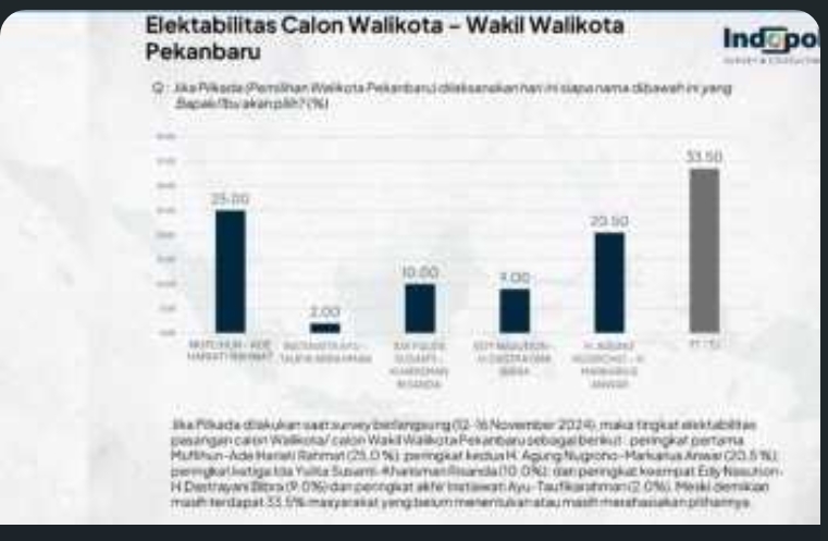 Kondisi ini terpantau dari website resmi IDC Media yang terpantau, Sabtu (23/11/2024). Dimana, keterpilihan atau elektabilitas Paslon Walikota dan Wakil Walikota Pekanbaru, Muflihun-Ade Hartati cukup kuat.