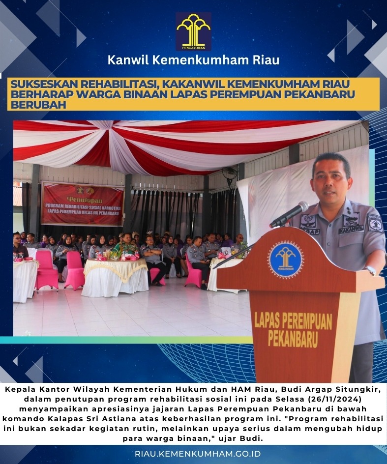 Kepala Kantor Wilayah Kementerian Hukum dan HAM Riau, Budi Argap Situngkir, dalam penutupan program rehabilitasi sosial ini pada Selasa (26/11/2024) menyampaikan apresiasinya jajaran Lapas Perempuan Pekanbaru di bawah komando Kalapas Sri Astiana atas keberhasilan program ini. “Program rehabilitasi ini bukan sekadar kegiatan rutin, melainkan upaya serius dalam mengubah hidup para warga binaan,” ujar Budi.